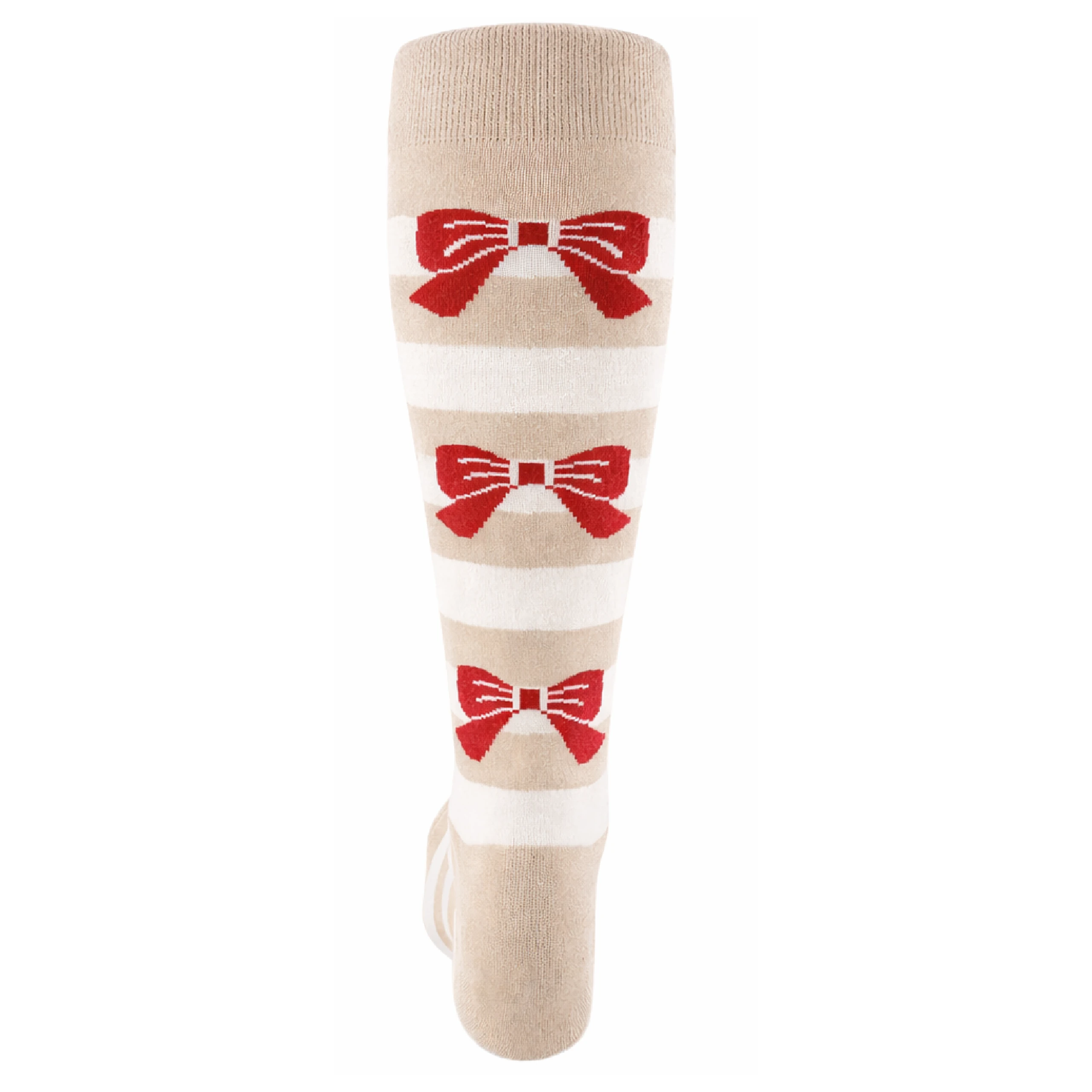 Add flair to any outfit with these adorable knee-high socks. Beige and white horizontal stripes create a subtle backdrop for the three red bows spaced evenly along each sock. This combination of classics with a girly touch makes them perfect for both everyday and special looks.