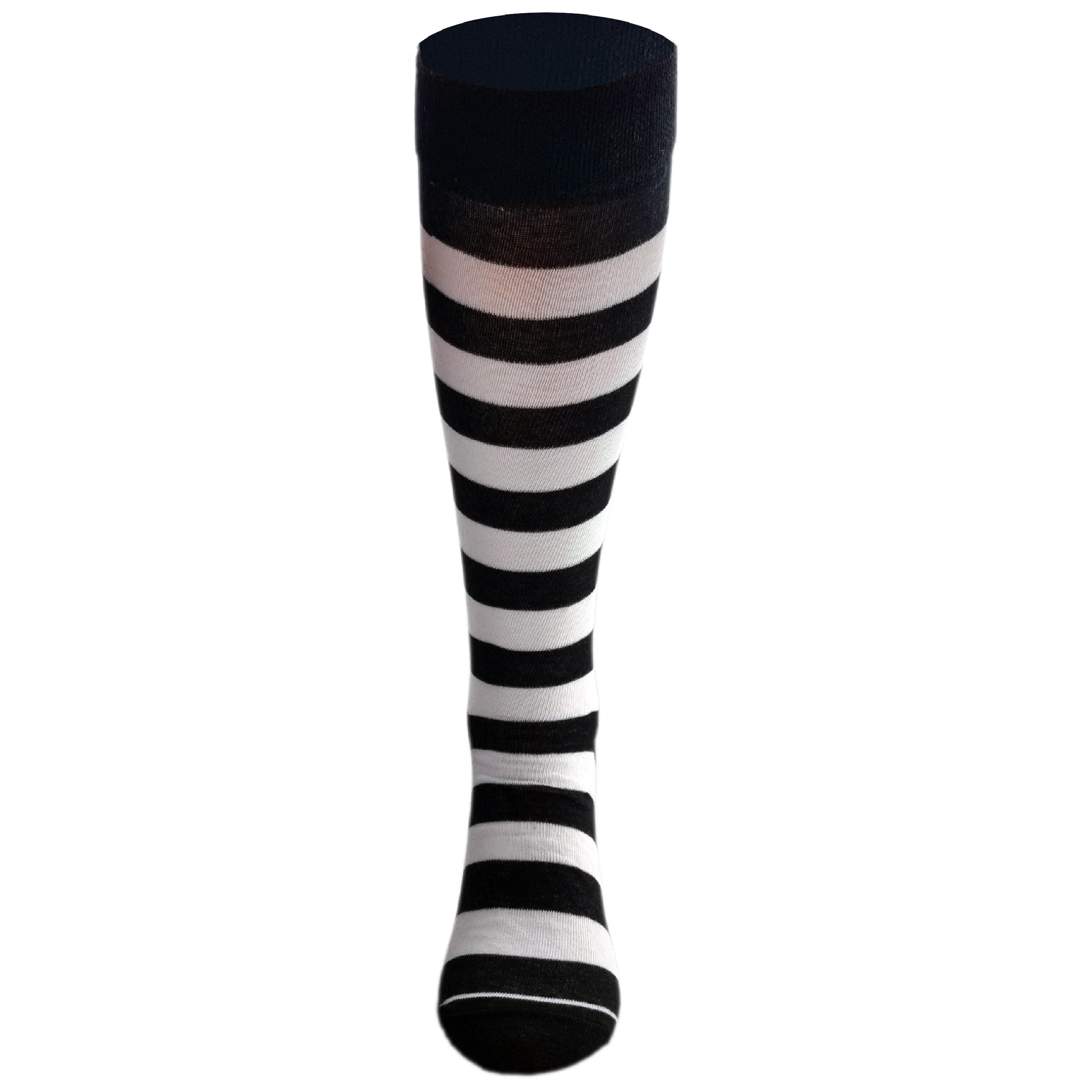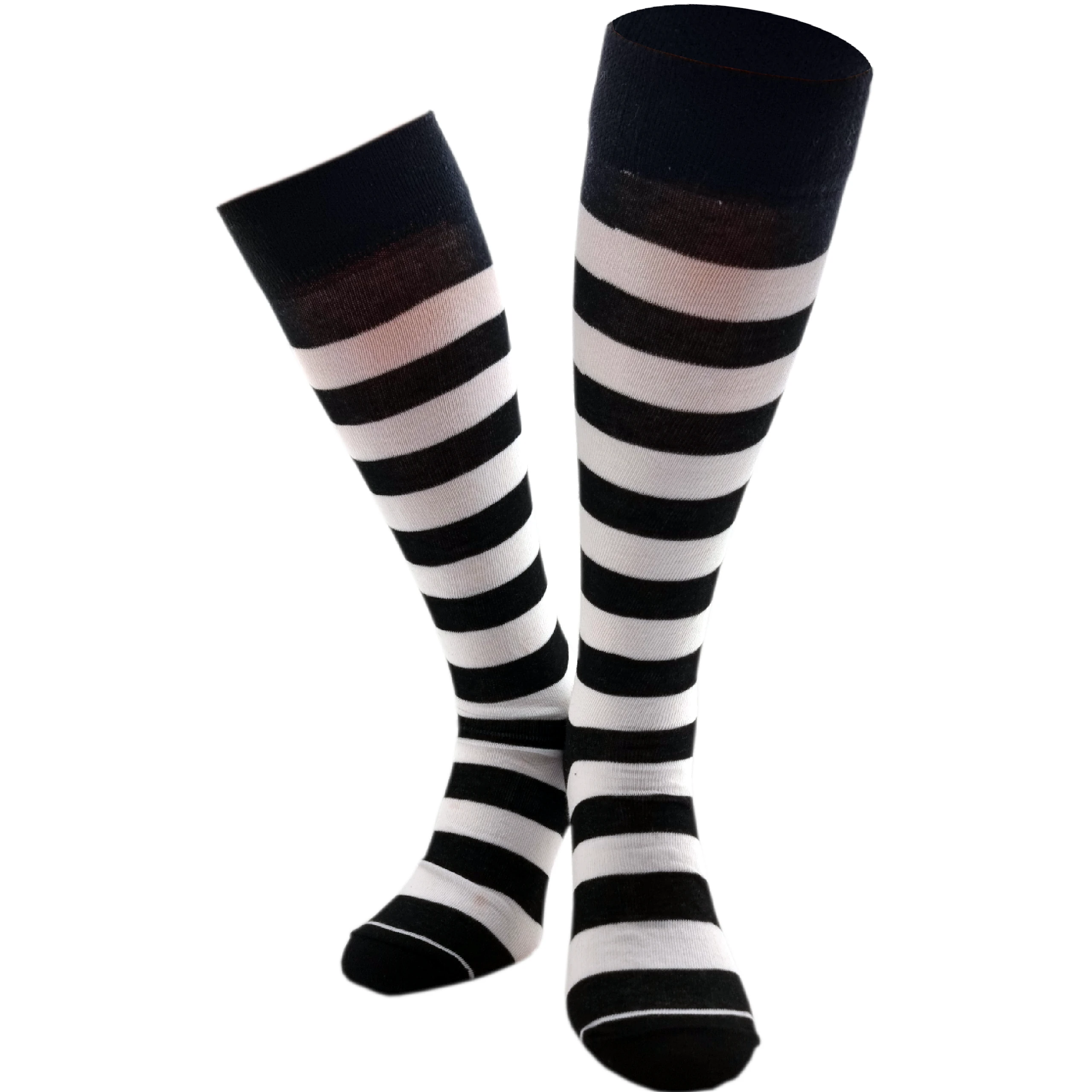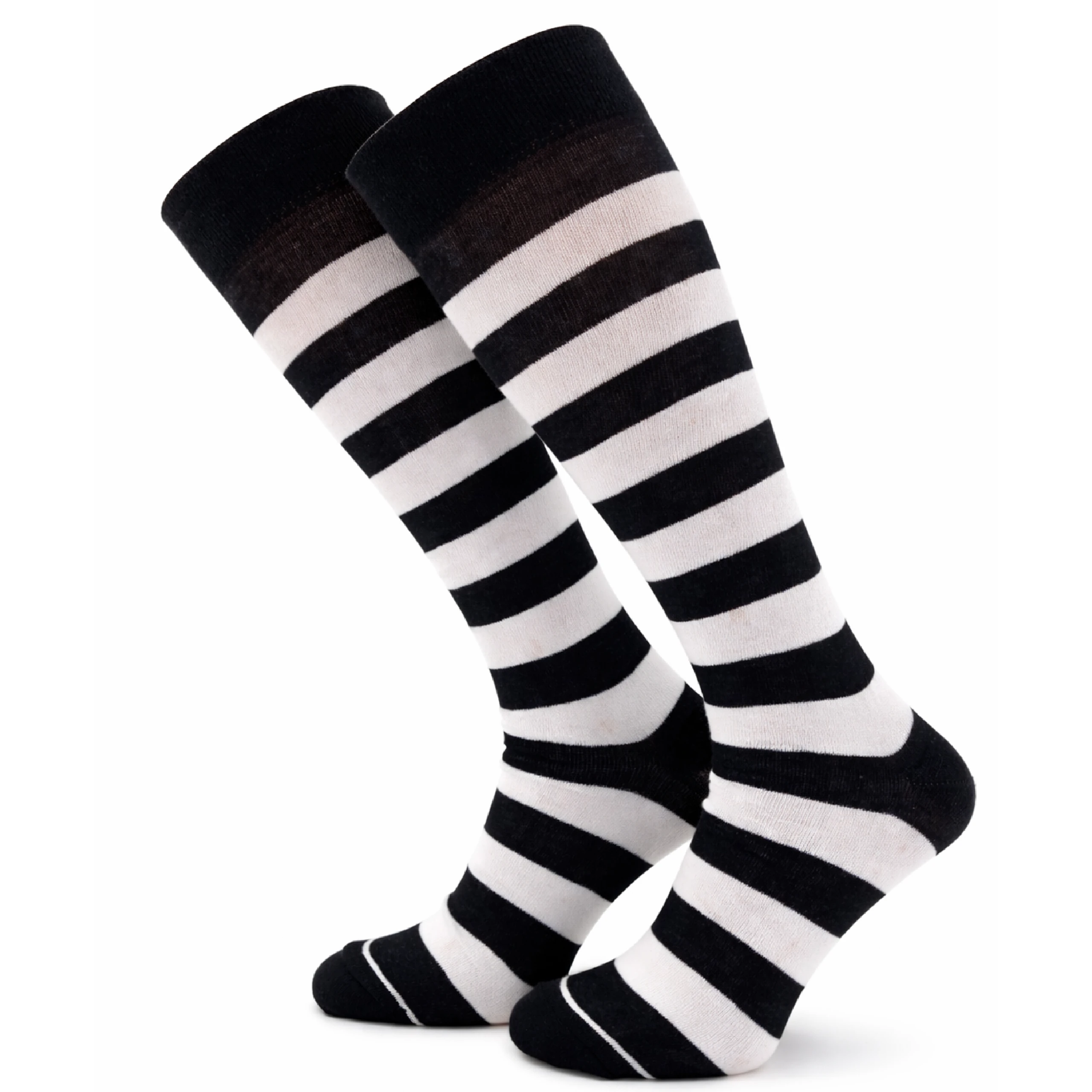 These crisp, knee-high socks with strong black and white stripes are the perfect accessory for those who like bold, graphic style. The contrasting stripes create a striking, rhythmic pattern that catches the eye and perfectly complements both everyday and more stylized outfits. Thanks to the flexible, soft material, the socks fit well on the leg and provide comfort all day long.