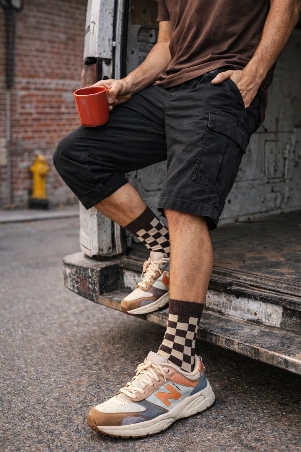 These socks in brown and beige checkered pattern are a bold and artistic accessory that stands out not only in color, but especially in form. The checkerboard pattern creates an optical illusion effect – as if the material moves with you. This is a proposal for those who like fashion with character and are not afraid of graphic accents.